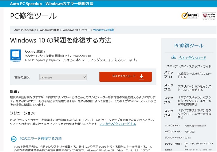 ユーザーの不安を煽って、修復ファイルと名乗るウィルスソフトのダウンロード、インストールに誘導します。